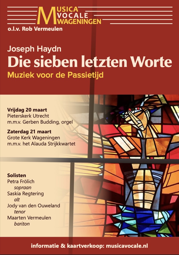 Op 21 maart geeft het Wageningse kamerkoor Musica Vocale een uniek concert met Haydns Sieben letzten Worte. Het koor onder leiding van dirigent Rob Vermeulen geeft regelmatig uitdagende concerten, meestal a-capella, en soms ook met instrumentale begeleiding. Zo zong het koor afgelopen november het virtuoze Stabat Mater van Domenico Scarlatti met continuo-begeleiding. In Wageningen speelt het Alauda Strijkkwartet de begeleiding.