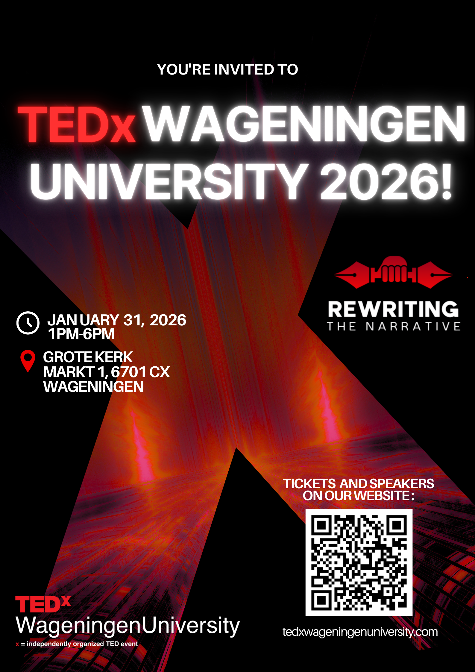 Zin in een middag vol verrassende perspectieven en interessante ideeën? TEDxWageningenUniversity komt terug – en het is open voor iedereen, zowel in Wageningen als daarbuiten! Locatie: Grote Kerk, Markt 1, Wageningen. Datum en tijd: 31 januari 2026, 13:00–18:00. Het thema van dit jaar is REWRITING THE NARRATIVE, met inspirerende sprekers, live ... Lees verder